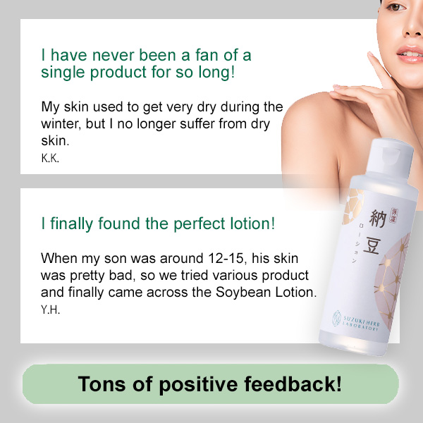 - When my son was around 12-15, his skin was pretty bad, so we tried various product and finally came across the Soybean Lotion. My son is now in his 3rd year of high-school and he said that as long as he kept using the Soybean Lotion, his skin will be fine, so I felt relieved. In this day and age where it’s not always easy to trust safety and authenticity, I feel like Suzuki Herb is reliable! I hope they will continue making trustworthy products. Handa