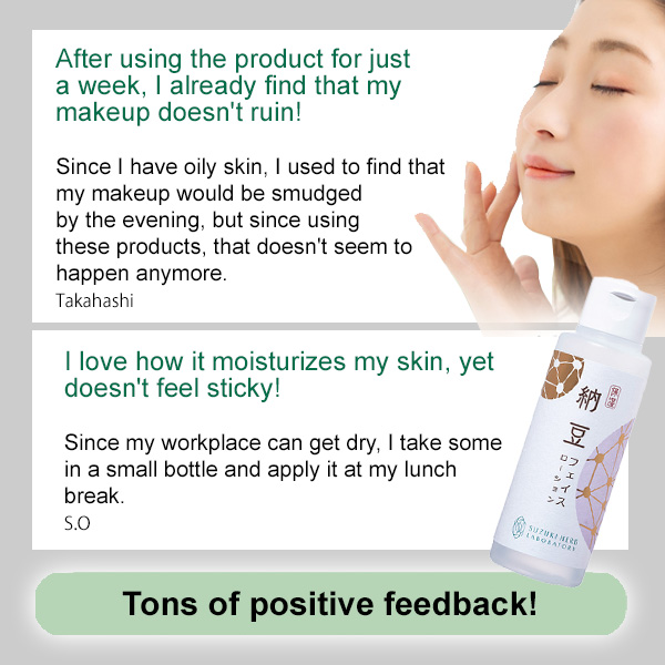 It has been a week since using the Natto Soap and Natto Lotion for Face, and I’m already impressed.I have oily skin, so my makeup would usually get smudged by the evening, but I don't seem to experience that anymore. I would like to continue using the products.