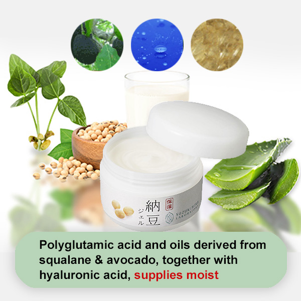 A gel that deeply moisturizes. Soybean Gel not only moisturizes the surface of your skin, but reaches right through to the inner layers, hydrating your skin from inside.The secret to the highly moisturizing Soybean Series is the polyglumatic acid contained in soybeans. It has double the ability to retain moisture than hyaluronan, which is also a highly moisturizing ingredient. The lotion does not have the stickiness or distinct smell.